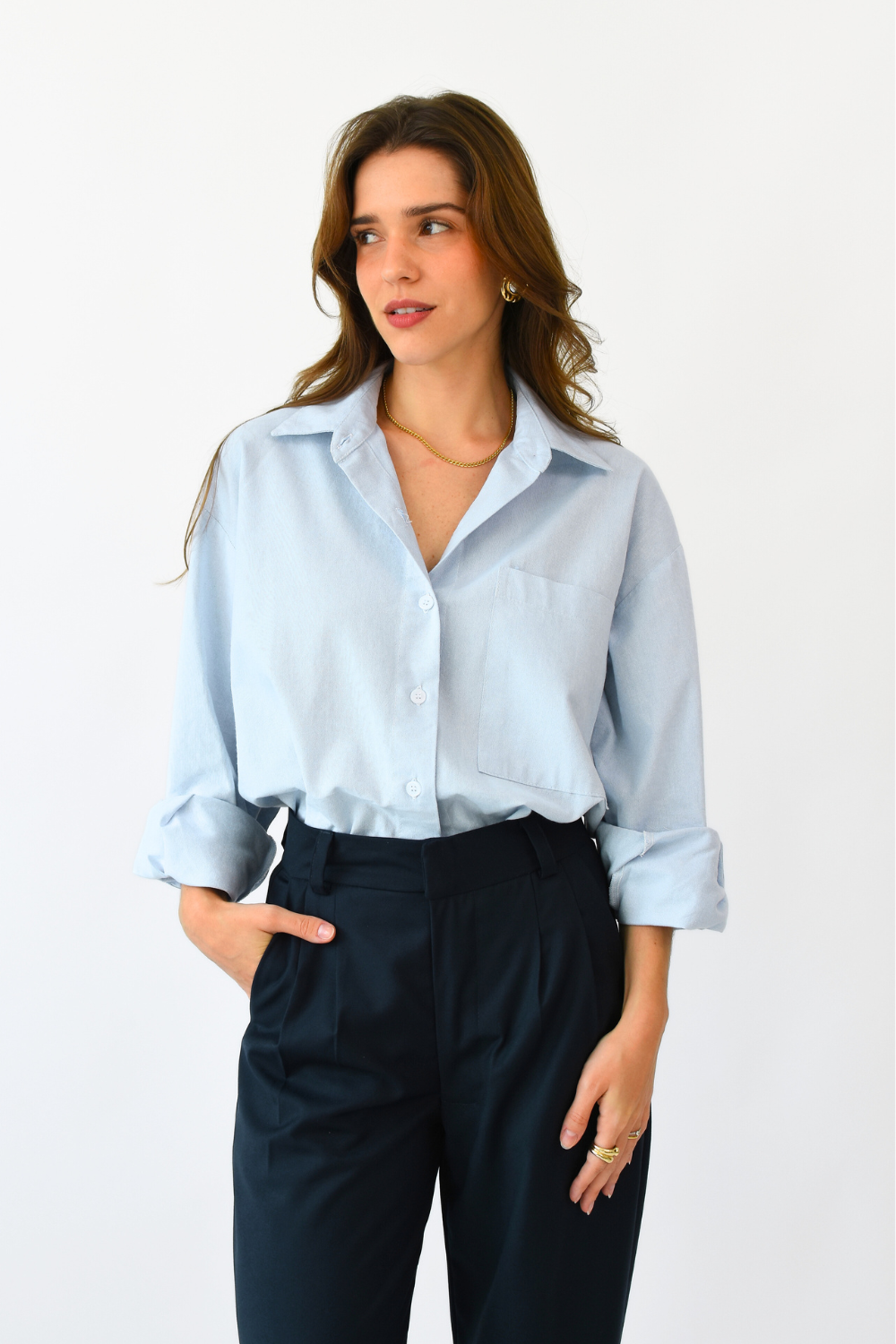 Camisa social no estilo oversized, com punhos e gola com entretela, botões frontais e no punho. Mangas amplas. Com bolso na frente. / Tecido: 100% algodão