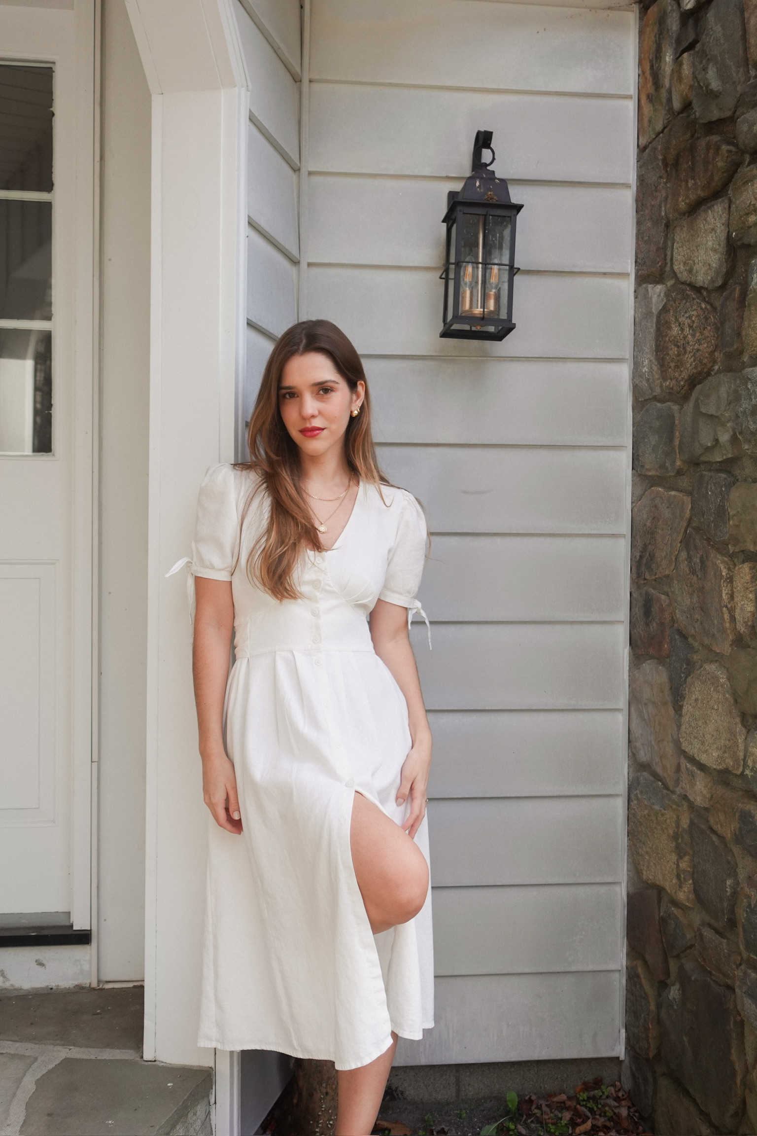 Vestido romântico de comprimento midi rodado e acinturado através de uma amarração nas costas. Possui decote em V e mangas bufantes. Com botões na parte frontal. / Tecido 55% linho 45% viscose (aspecto rústico) /