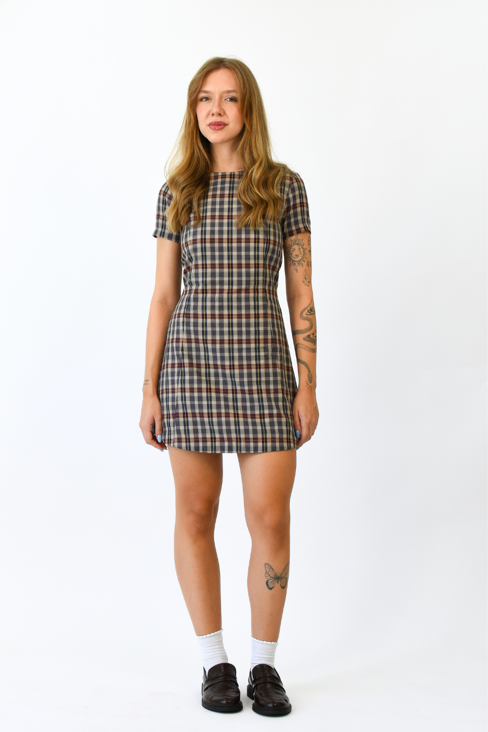 Vestido com mangas curtas, modelagem ajustada ao corpo e saia com caimento reto. Possui costas com fechamento em zíper e é ajustável na parte de trás. Estampa xadrez. / Tecido: 100% algodão.